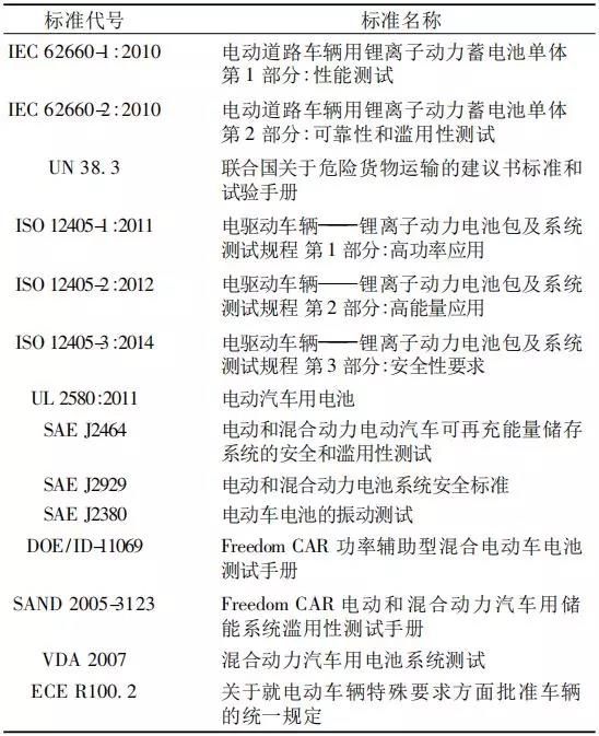 ISO在动力锂离子电池方面制定的标准有ISO 12405-1∶2011《电驱动车辆———锂离子动力电池包及系统测试规程 第1部分: 高功率应用》、ISO 12405-2∶2012《电驱动车辆——锂离子动力电池包及系统测试规程第2部分: 高能量应用》及ISO 12405-3∶2014《电驱动车辆——锂离子动力电池包及系统测试规程 第3部分: 安全性要求》,分别针对高功率型电池、高能量型电池以及安全性能要求,目的是为整车厂提供可选择的测试项和测试方法。