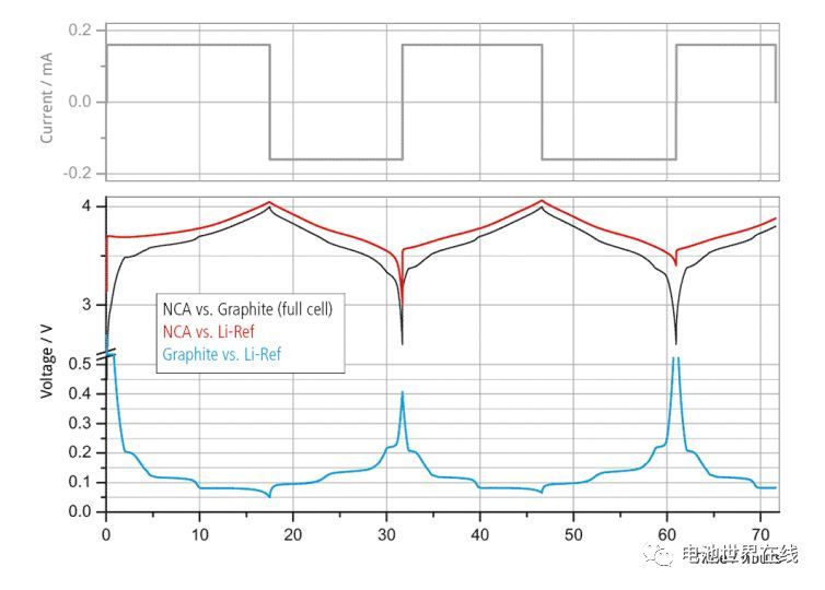 2  三电极电池电流、电压曲线(来源https://el-cell.com/