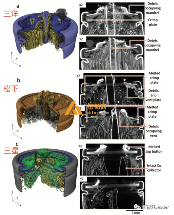从上面的分析不难看出18650电芯内部的中心针对于电池在热失控中的行为有着显著的影响,从下图b和c多宝电竞能够注意到在热失控产生的气体推动下,LG-B4和三洋电池的中心针都出现了明显的上移,中心针的存在避免了电芯向中心塌缩,为气体扩散提供了足够的扩散通道,减少了气体喷发时带出的正负极活性物质,降低了热失控向周围电池扩散的风险。